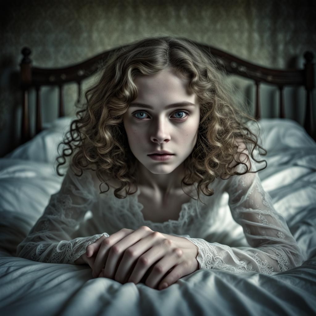 This image shows the transparent ghost of a young girl clinging to a bed frame. The ghostly figure has a round face, pale skin, curly hair and is rendered with hyperrealistic detail.