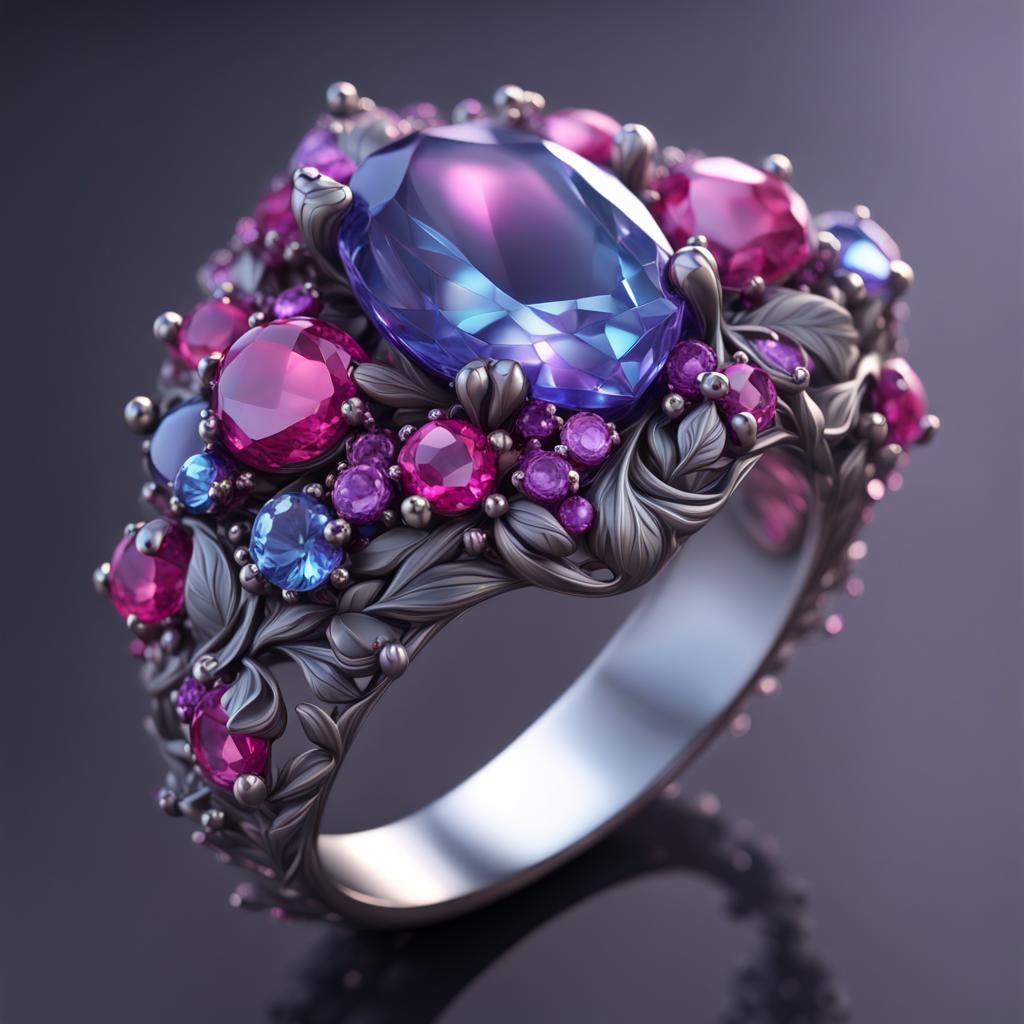 This image showcases a stunning ring crafted from bluish-silver metal. Pink and purple gems, shaped like leaves, adorn the ring. The piece is rendered as detailed fantasy concept art.