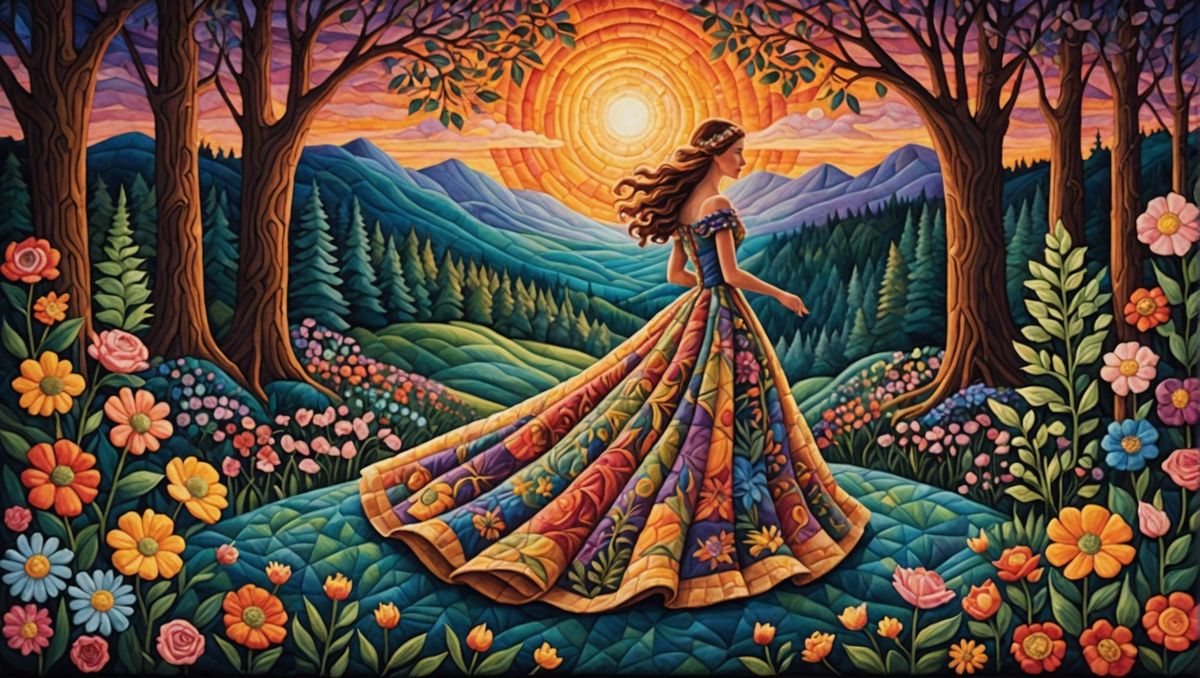 This image shows a woman in a gown walking through an enchanted forest. The surreal, quilted landscape is illuminated by candlelight, rendered in high resolution with vibrant colors, and intricate, elegant details in the style of magic realism.