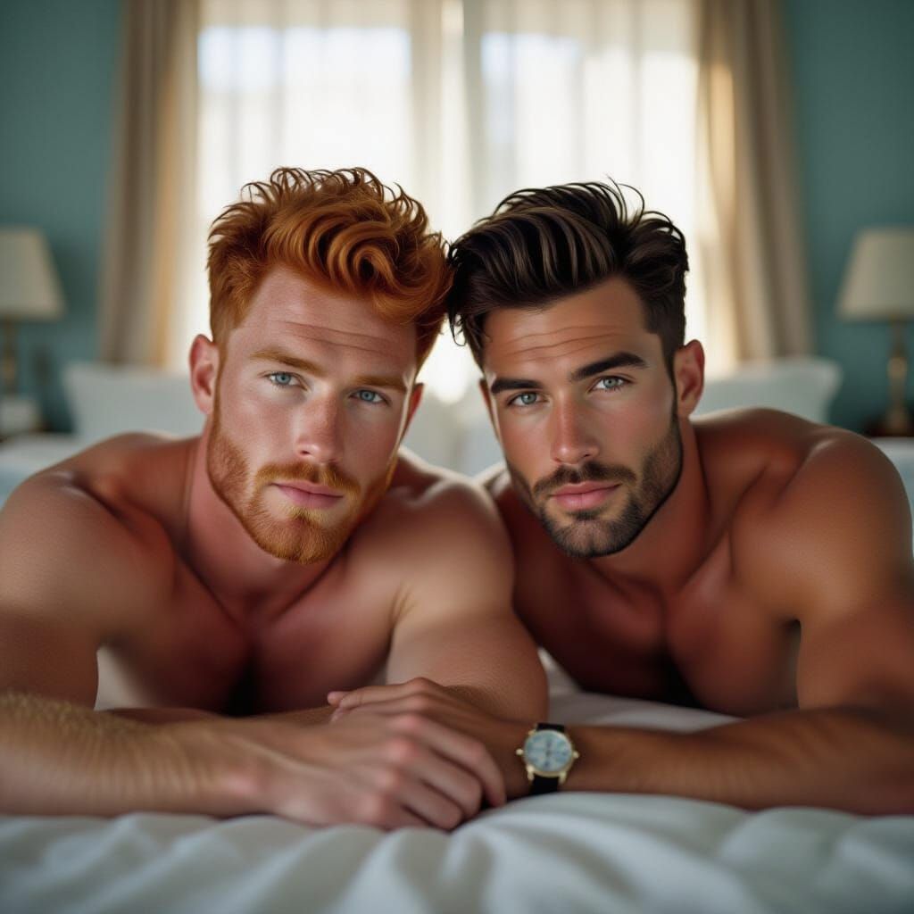 Generate your own unique images of hairy men, shirtless and barefoot, laying on a bed at night. It's free and easy!