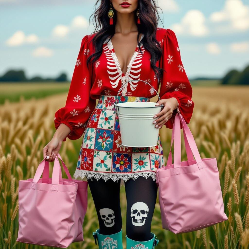 This image shows a woman with dark hair and red highlights in a patchwork blouse, holding a bucket in a field. The photorealistic style captures elements of documentary photography.