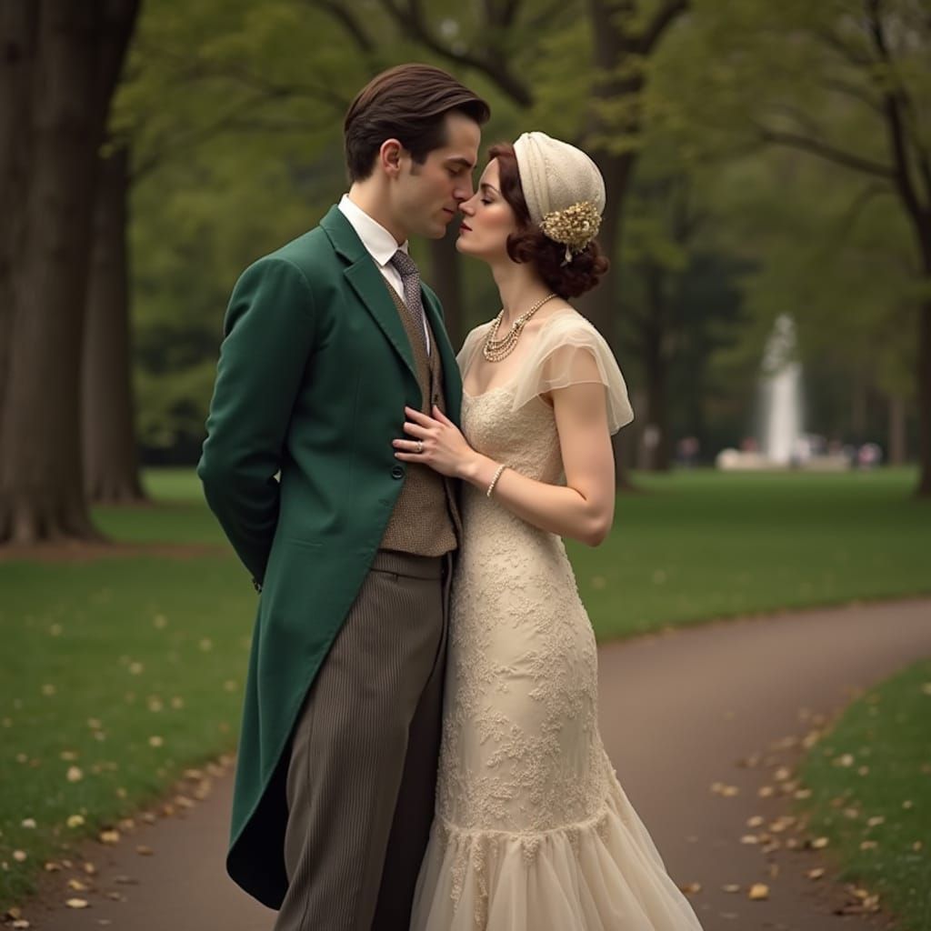Art Deco, Lady Mary Crawley (Michelle Dockery) in a Frederick Worth gown, standing in Hyde Park in 1930s England. She is holding Tom Branson (Allen Leech), brunette, Irish, green suit. JMW Turner.