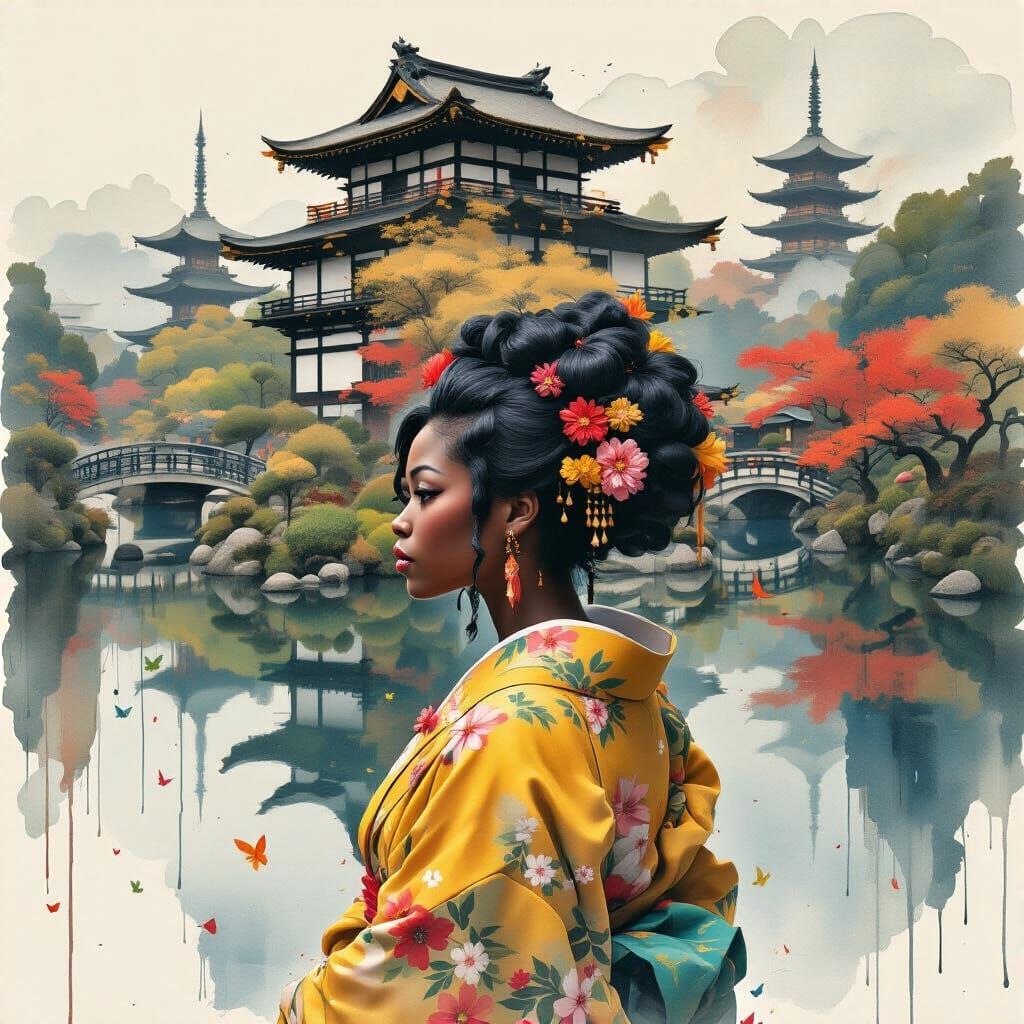 This image shows a Black woman with flowers in her hair, wearing a yellow floral kimono, set against a serene Japanese autumn scene with pagodas and colorful trees. The art has a painterly, watercolor style.