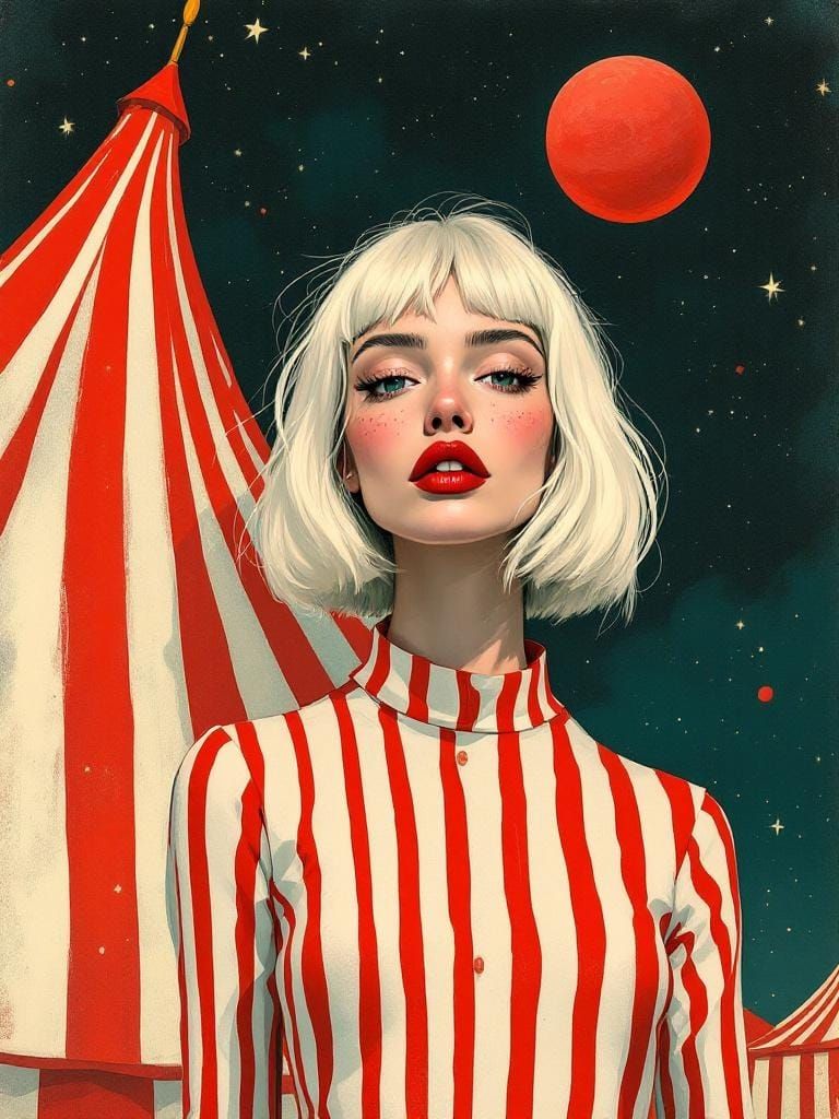 This image shows a confident woman with striking red lipstick against a surreal red and white striped background. The artwork blends expressive linework with contemplative earth tones, creating a whimsical yet melancholic atmosphere.