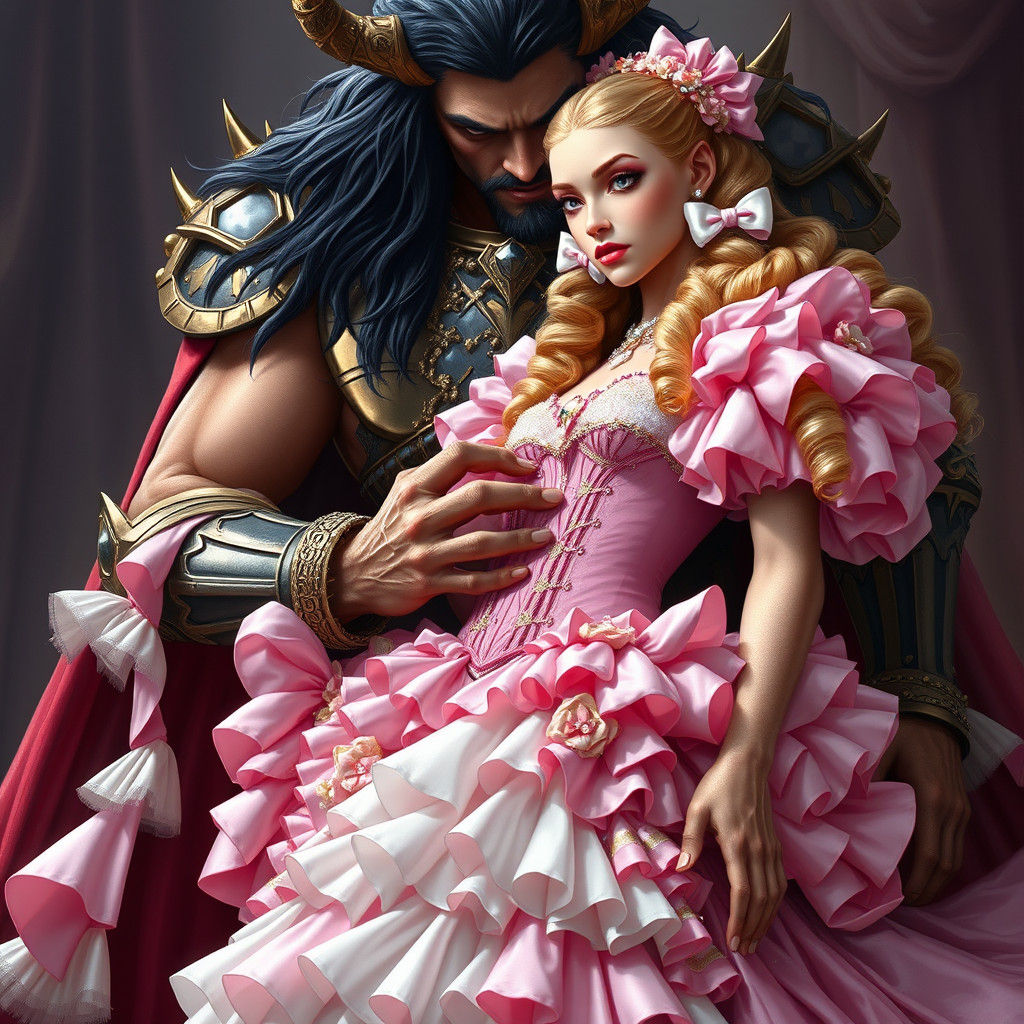 This image shows a muscular demon king in jeweled armor holding a delicate princess in a frilly pink dress. The king buttons her corset, his expression conveying pride and ownership.