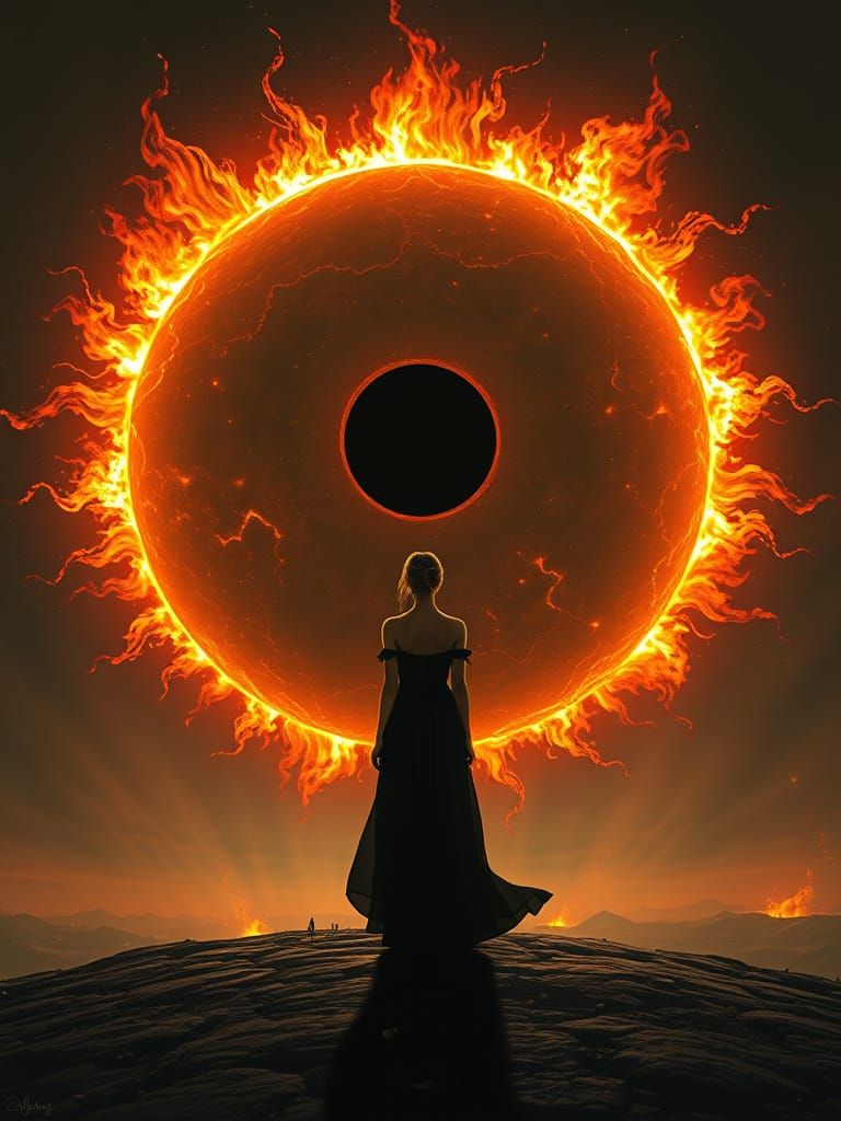 A solitary woman in a black dress observes a dark sun. Fiery flames surround a black hole in the sun's center, creating a cosmic horror aesthetic as a digital painting.