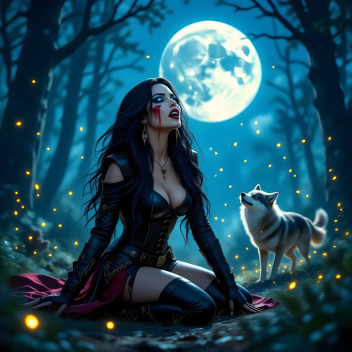 This image shows a beautiful vampire woman with dark hair and blue eyes transforming into a wolf under a bright moon in an enchanted forest, surrounded by fireflies.
