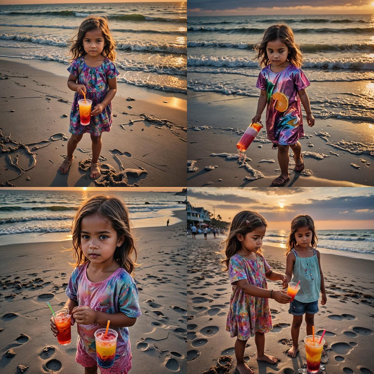 This image shows a young girl holding a colorful ice slushie on a beach at sunset. The hyperrealistic picture features intricate details, sharp focus, and a cinematic, atmospheric mood.