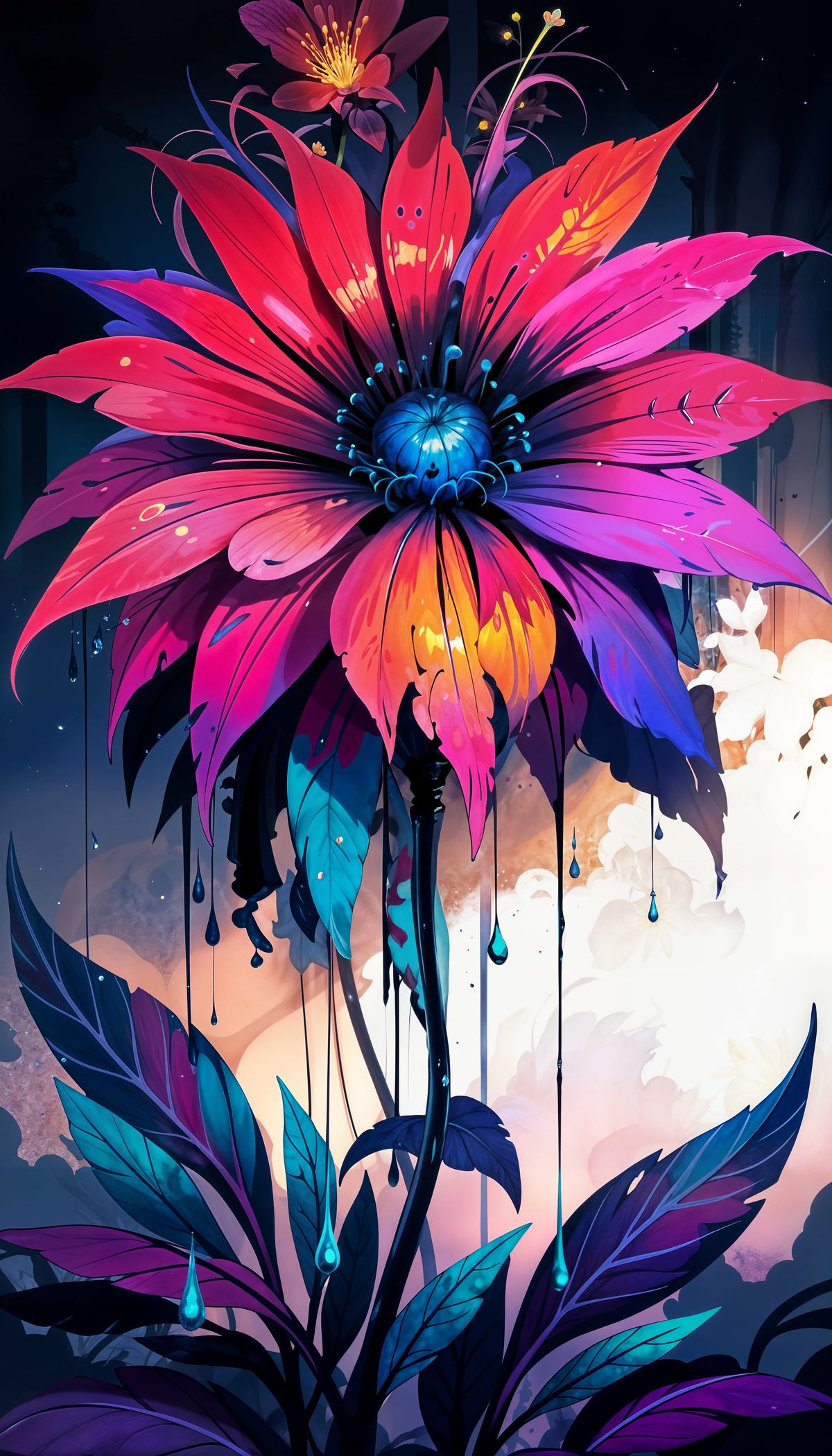 This image showcases a surreal, vibrant flower with neon pink, purple, and orange petals radiating from a glowing blue center. It features intricate details and luminous liquid drips, set against a dreamy, atmospheric background in a digital fantasy art style.