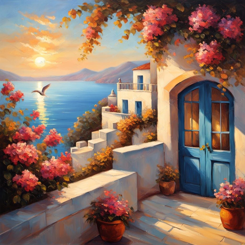 Generate your own stunning Mediterranean sunset images, complete with balconies and seascapes, using our free AI tool.