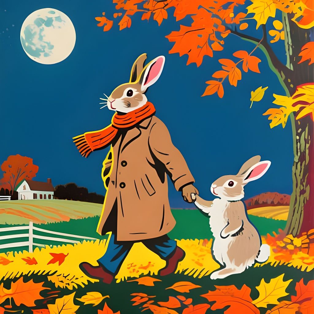 This image shows a surreal autumn date night scene with a rabbit. The artwork blends pop art and American Gothic styles to create a visually striking and unique composition.