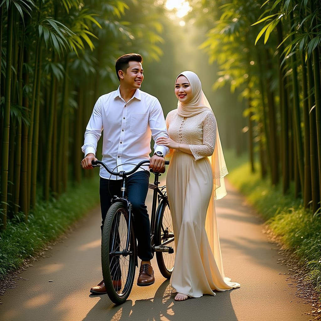This image depicts a Malay couple riding a bicycle in 1960s Malaysia. Soft sunlight filters through bamboo groves, with a shallow depth of field and warm golden light. The image has a vintage, photorealistic style.