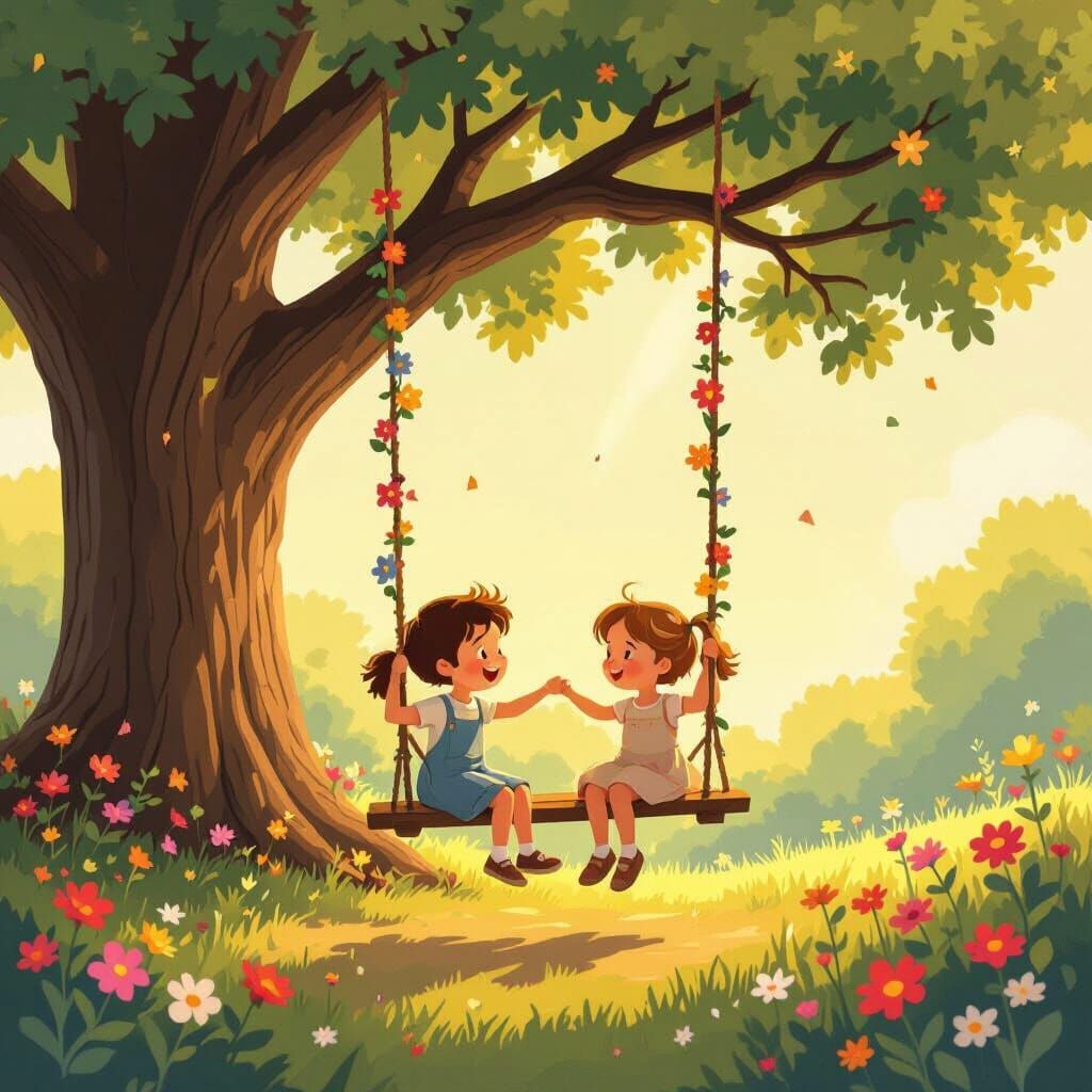 A heartwarming illustration of a father gently pushing his joyful daughter on a wooden swing. Sunlight dapples through the leaves, creating a golden glow around vibrant flowers on the ropes.