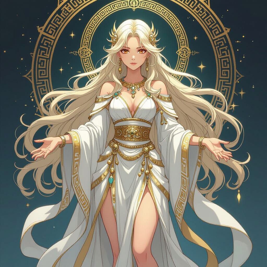 This image shows a mature goddess with long, ashy blonde hair, dressed in flowing white and gold robes. The anime-style artwork features intricate details and a mystical aura, reminiscent of a Greek goddess.
