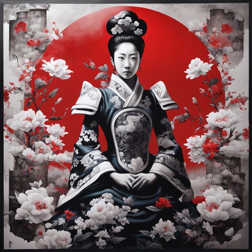 This image shows a princess in a traditional Japanese setting, with a steampunk twist. Dominant white and red colors are used in a style reminiscent of 18th-century Japanese art, with subtle nods to Tosa Mitsunobu's techniques.