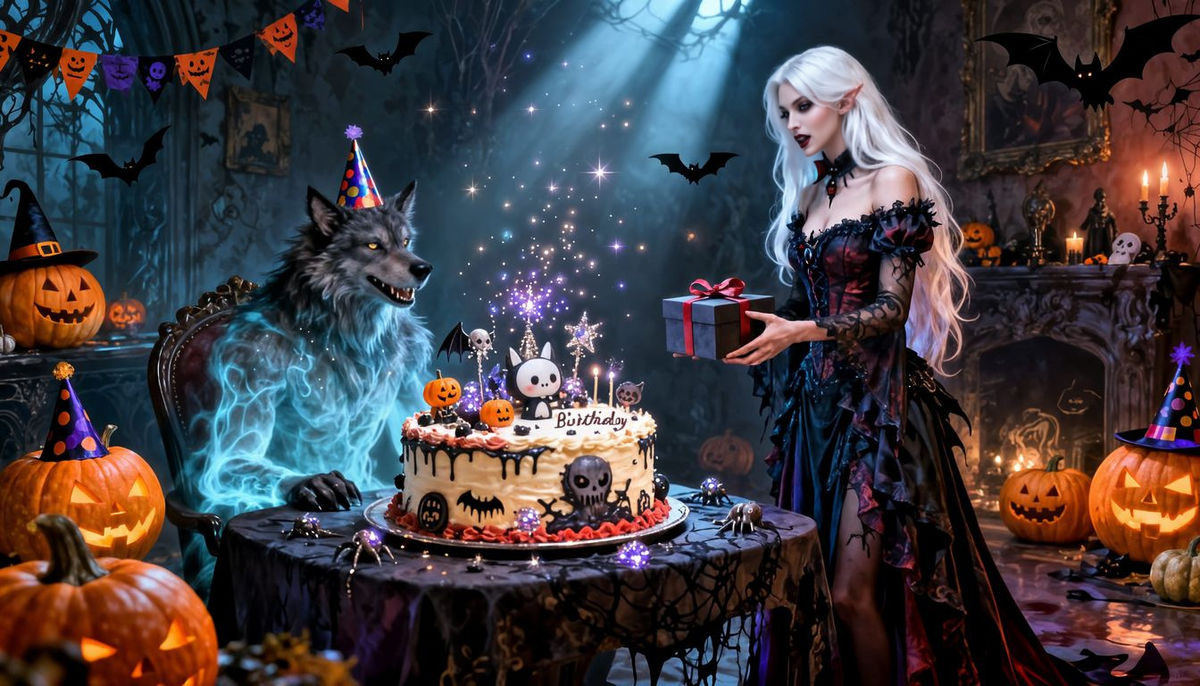 A dark fantasy scene featuring a gothic birthday cake with cute, creepy toppings. A vampiress offers a gift to her werewolf boyfriend in a room decorated for a happy Halloween birthday.