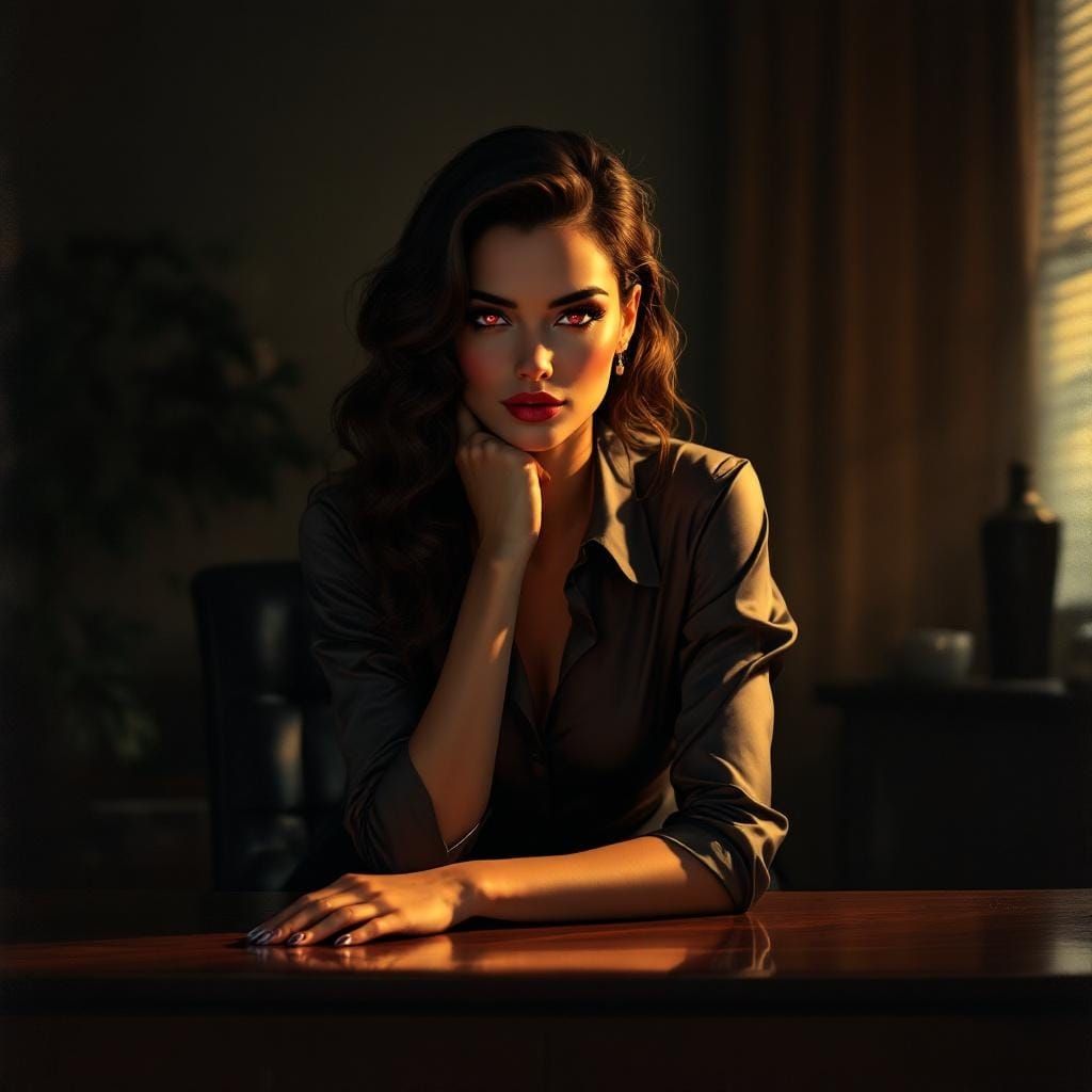 A striking picture of a woman in business attire leaning over a desk in an office. The image is in a noir aesthetic, with vibrant colors and elegant lines.
