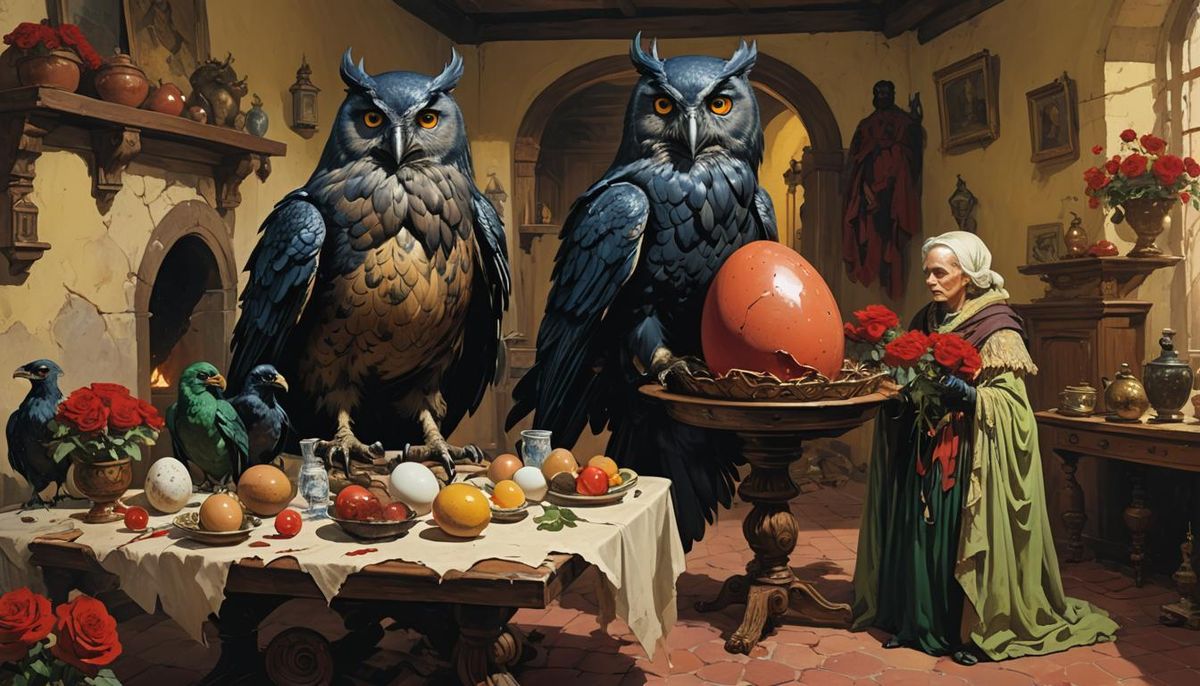 This image shows a surreal scene of bird-like parents watching their baby hatch from a giant egg. The scene is set in a room with a fireplace, stone floor and blood-red roses in a Frazetta-esque style.