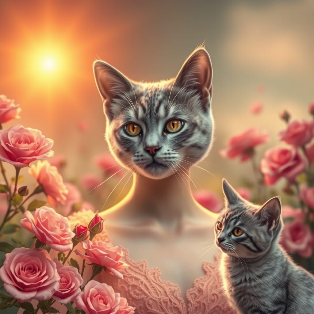 This image shows a realistic depiction of a woman engulfed in flames, surrounded by vibrant roses and a majestic grey cat. The scene is rendered in a highly detailed and lifelike style.