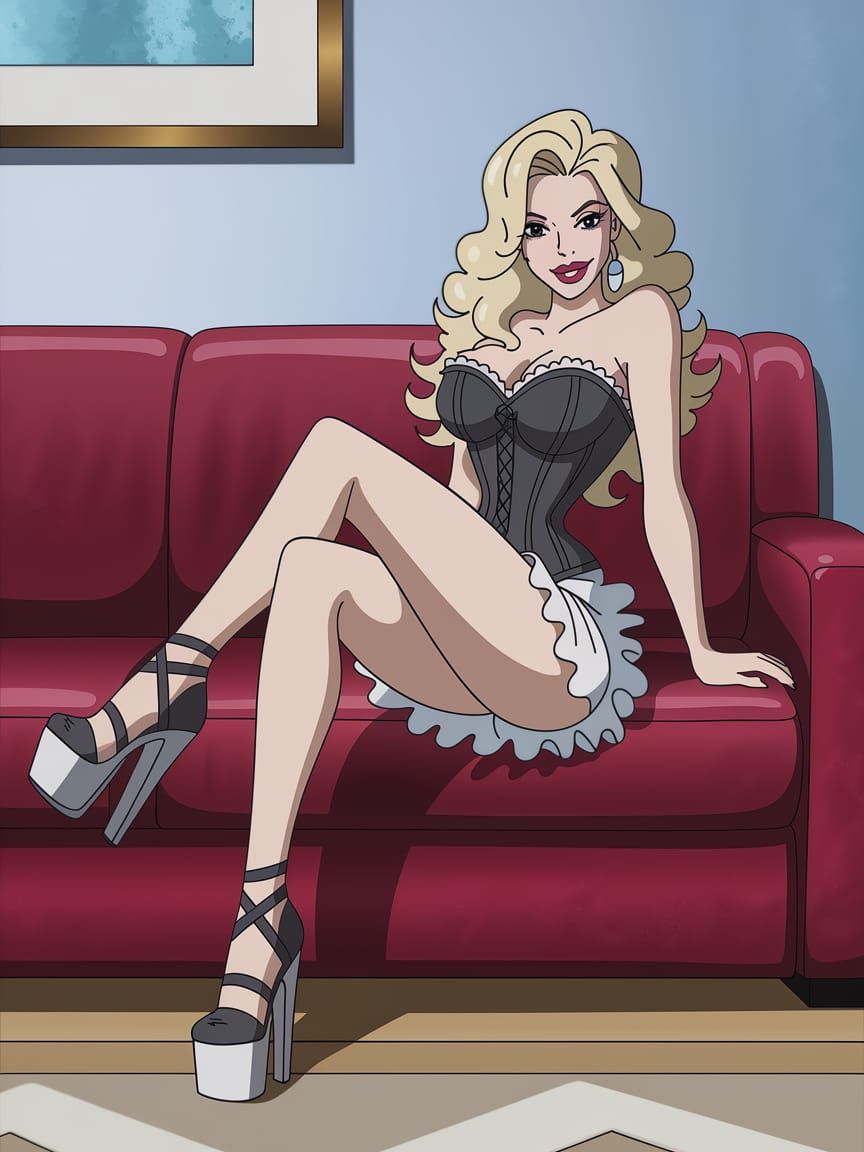 This image features a beautiful blonde Italian woman in a gothic-meets-gypsy style outfit, seated on a couch. The view is a low-angle shot emphasizing her high platform heels and crossed legs.