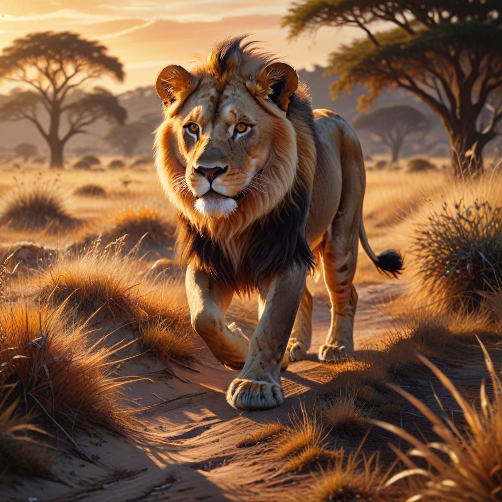 A striking picture of a lioness prowling the African savanna. The low-angle perspective, golden light, and vibrant colors create a surreal and dreamlike atmosphere in an oil painting style.