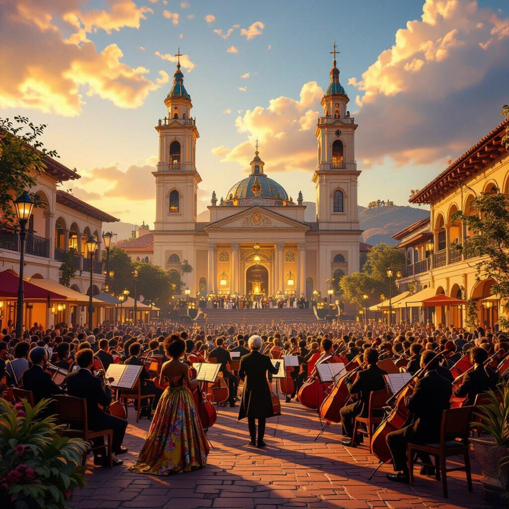 This image depicts the Mozart Festival in Johannesburg, South Africa, blending classical music with African culture. Rendered with rich textures and cinematic lighting, it captures a vibrant, fantastical scene.