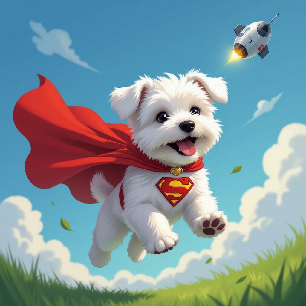 A vibrant comic book style image of Krypto, a white terrier superhero dog, in flight. He wears a red cape and is playing fetch with a flying probe.