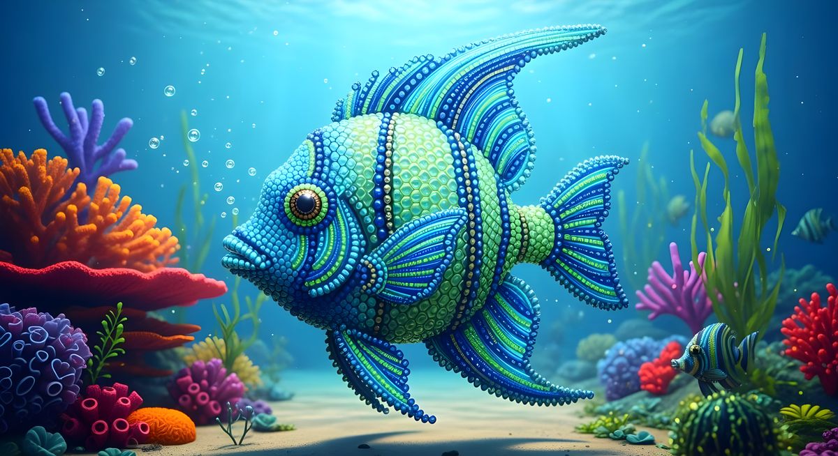 This image shows a surreal, glittering exotic fish created from tiny blue and green crystal beads. The fish is set against a backdrop suggestive of an underwater oasis, rendered with dreamlike qualities.