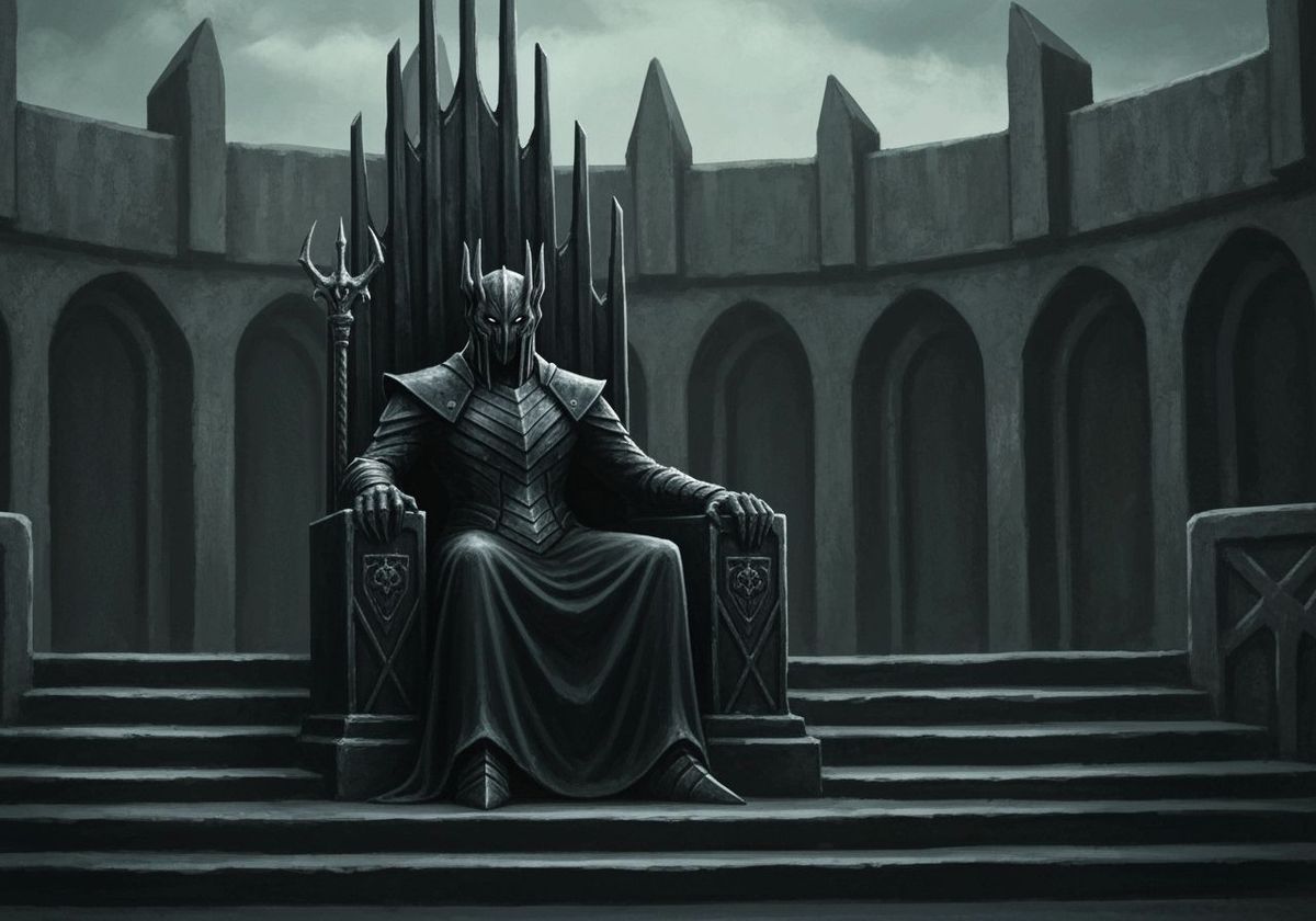 This image depicts Sauron on his dark throne in Barad-Dur, receiving Harry Potter. The scene is rendered with a horror aesthetic, emphasizing ghastliness and evil in muted colors.
