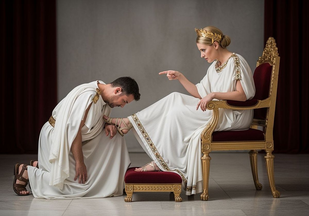 A striking picture of a Roman senator kneeling before a beautiful empress. Seated on a golden throne, she presses her foot on his neck. The photograph features soft, natural lighting, shallow depth of field and noticeable bokeh.