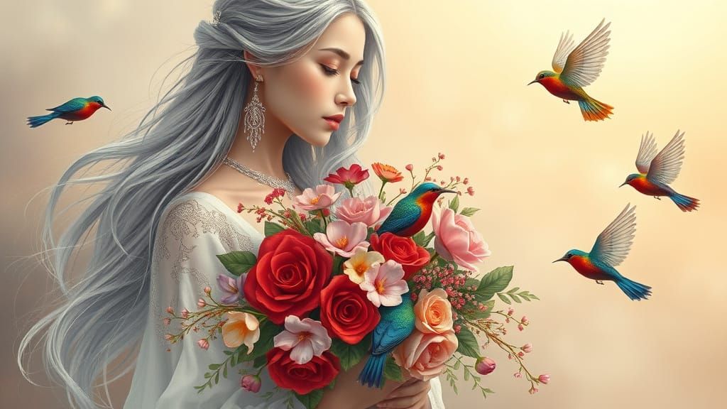 This image features a serene woman surrounded by a lush bouquet of colorful flowers and birds in effortless flight, set against a softly lit, misty dawn background, reminiscent of Persian miniatures.