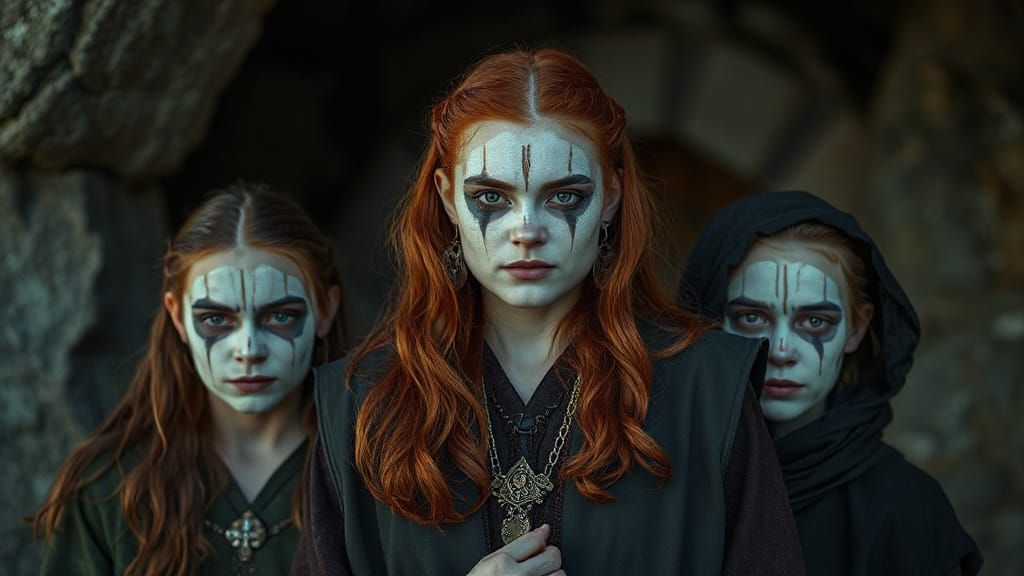 This image captures a powerful moment of sisterhood and mystique, with three witches standing proudly, their faces painted with striking white markings, surrounded by cinematic lighting and a shallow depth of field, reminiscent of 16mm film and professional photography masterpieces.