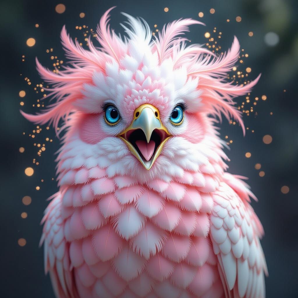 fantastically beautiful gothic museum collection of tropical pink/white with gold big bird Kakadu, appreciates and shows its teeth, laughs, blue eyes, fluffy bushy fur, swirl of sparks, fantasy art, ultra detail, hyperrealism, shimmer, paisley, floral print, fine details, bokeh and shimmering dust, fog, ...
