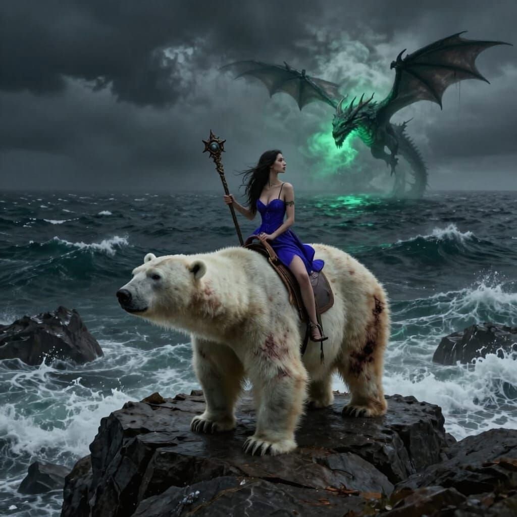 A sorceress on a scarred polar bear watches a dragon over a stormy sea. Rendered in hyperrealistic style with dramatic lighting and dark, brooding colors for a grim fantasy feel.