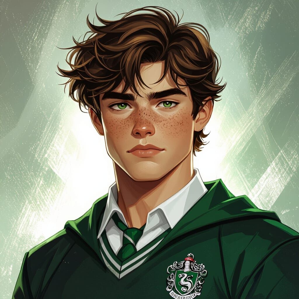This image features a tall, athletic young man in a Slytherin Quidditch uniform. Dramatic lighting highlights his determined expression and athletic build, rendered in a detailed concept art style.