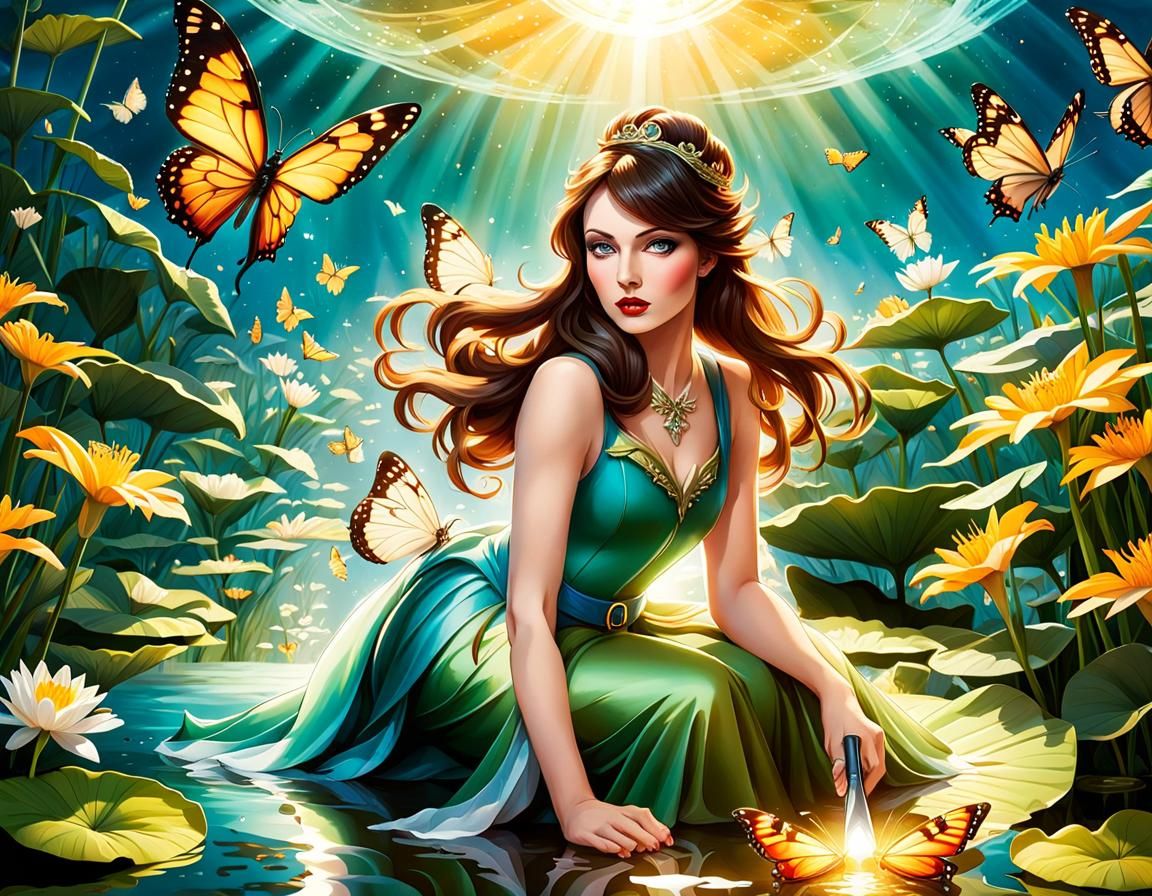 A striking picture of Thumbelina holding a knife while sitting on a lily pad in a pond. Butterflies surround her as she stares menacingly at the camera, with sunrise backlighting.