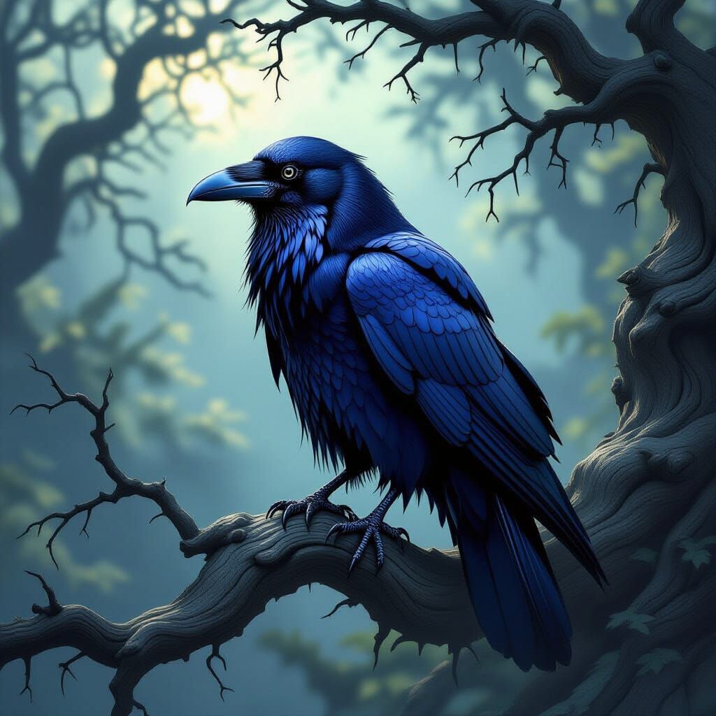 This digital art captures a regal raven with shimmering purple and black feathers, perched on an ancient branch. It features a gothic aesthetic with dramatic lighting and atmospheric colors.