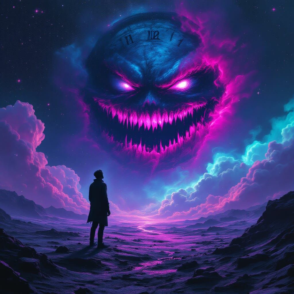 A surreal scene of a figure contemplating existence under a grinning clock in space. This image captures a neon-noir futuristic style with electric colors and an eerie, unsettling atmosphere.