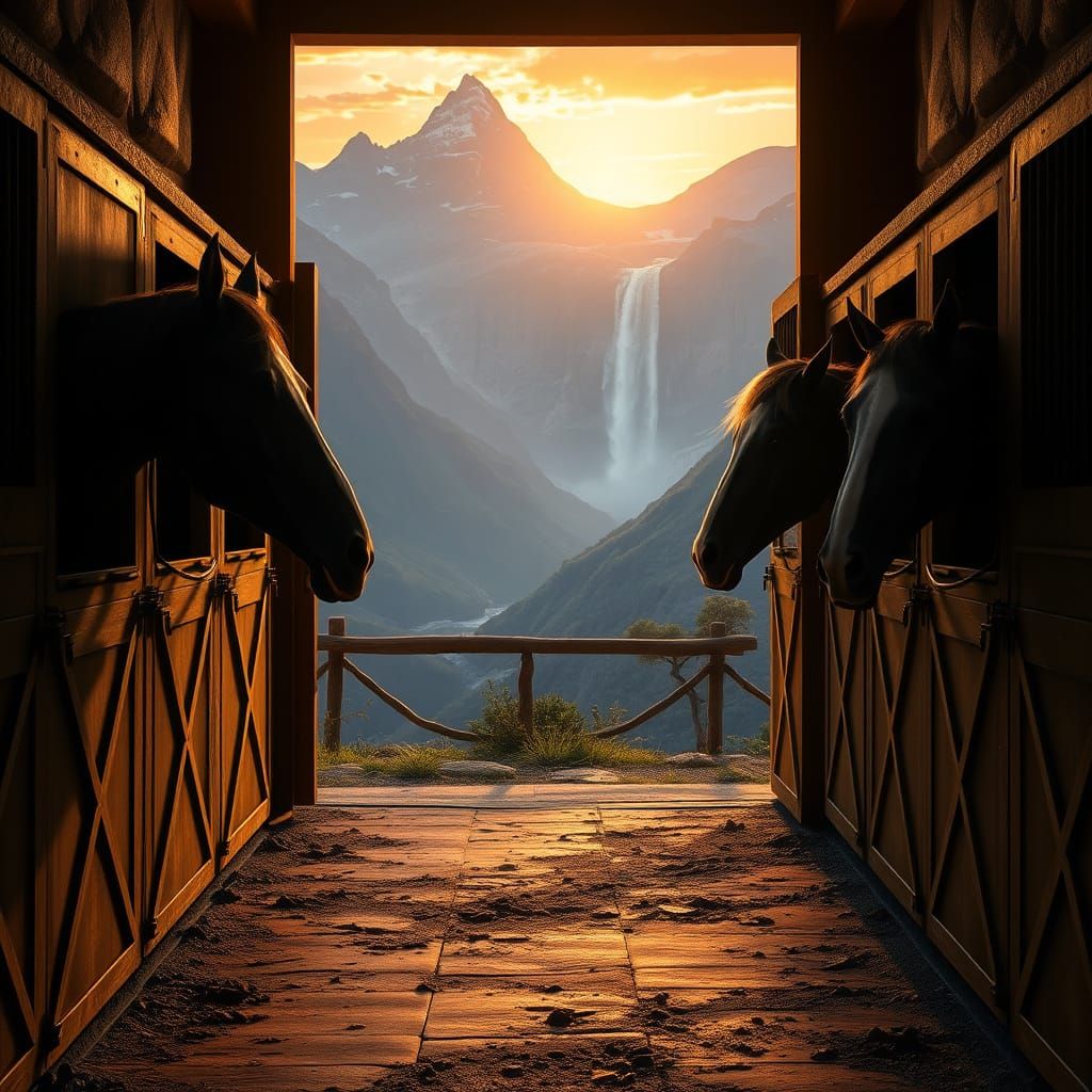 This image depicts serene horse stalls bathed in warm sunset light, with black and white horses standing calmly as a breathtaking mountain landscape with a cascading waterfall unfolds through the doorway, in a detailed matte painting style reminiscent of fantasy concept art