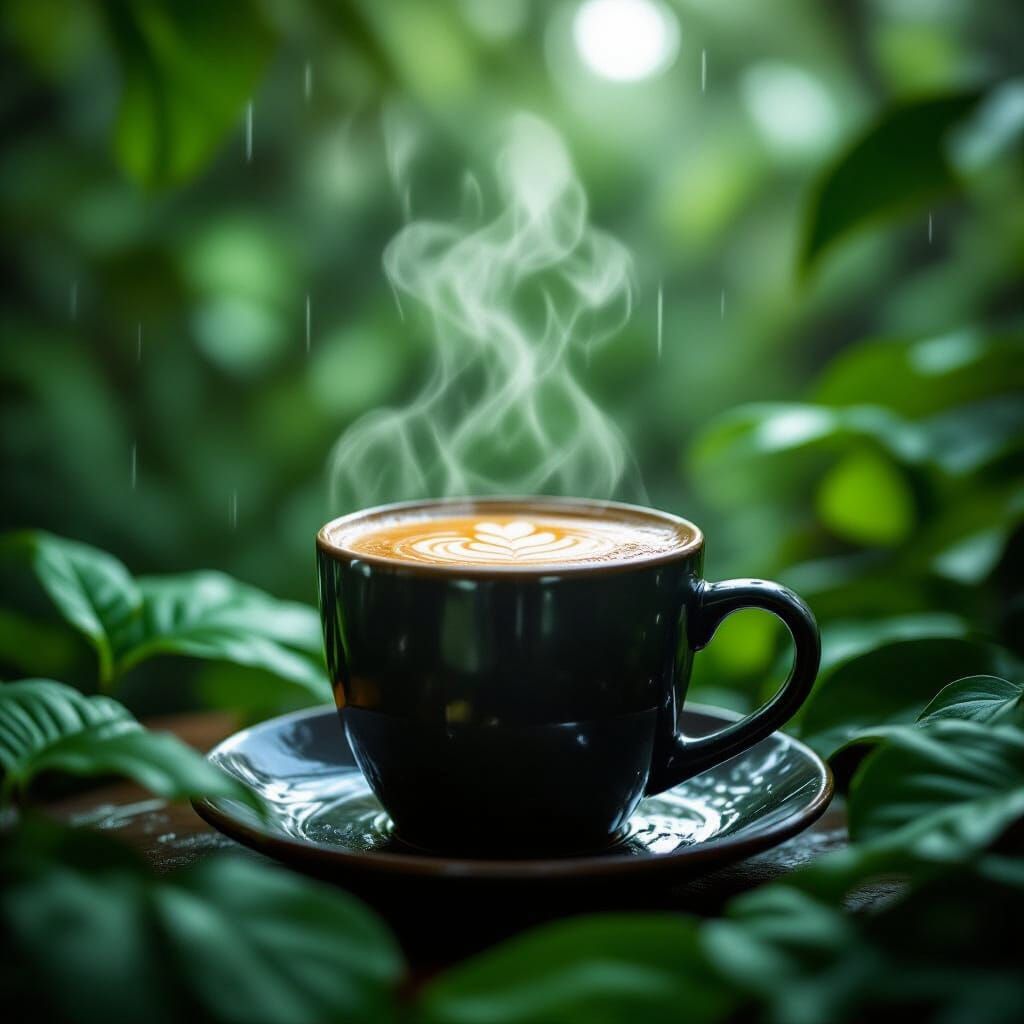 A realistic photograph of a steaming latte in a dark mug, set amidst a vibrant jungle scene. Raindrops glisten on the surrounding foliage, enhancing the warm lighting and atmospheric depth.