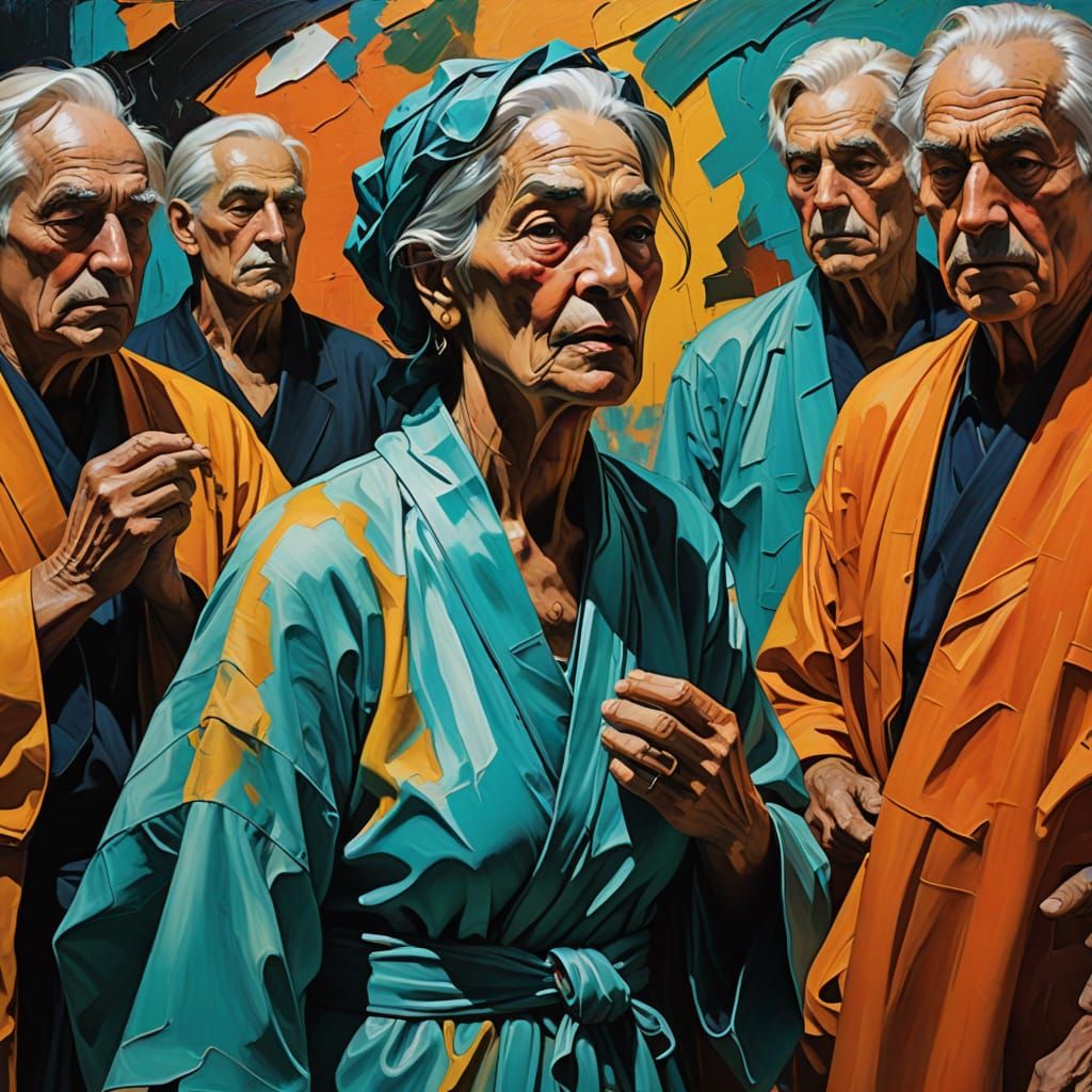 This abstract expressionist painting depicts an 80-year-old courtesan priestess in a temple brothel, surrounded by adoring male worshippers. Thick brushstrokes and clashing colors like turquoise and orange create a dynamic, emotive scene with intricate patterns on the temple walls.