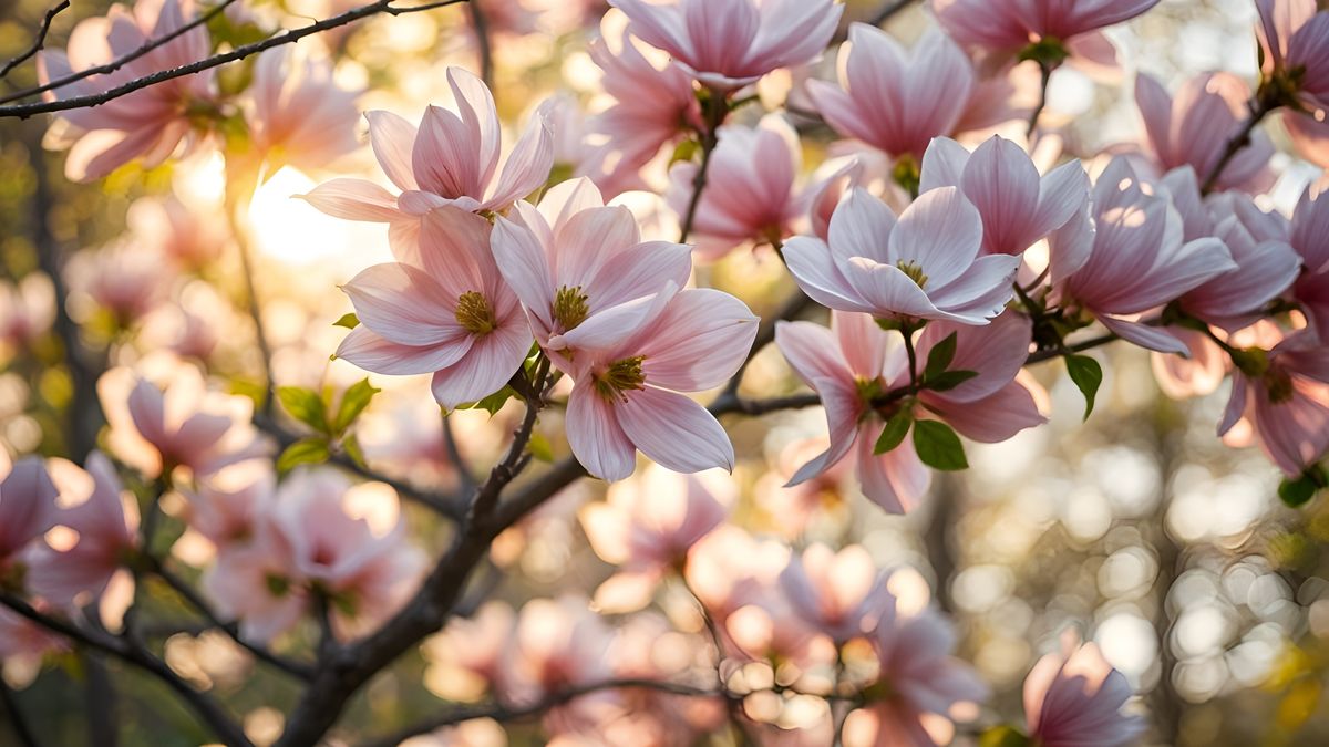 This image captures the serene beauty of dogwood trees in bloom, bathed in the soft, warm light of spring. The intricate details of the petals and bark are showcased in stunning clarity, reminiscent of professional photography.