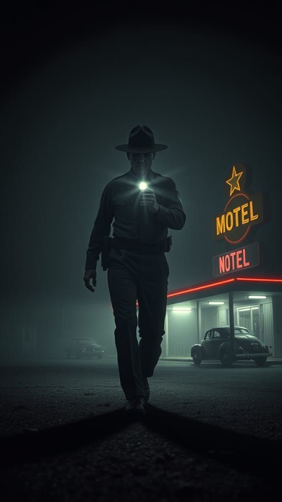 This AI-generated movie poster depicts a dark, foggy night at a vintage roadside motel. A lone State Trooper walks towards the viewer, his flashlight cutting through the gloom, creating a sense of dread.