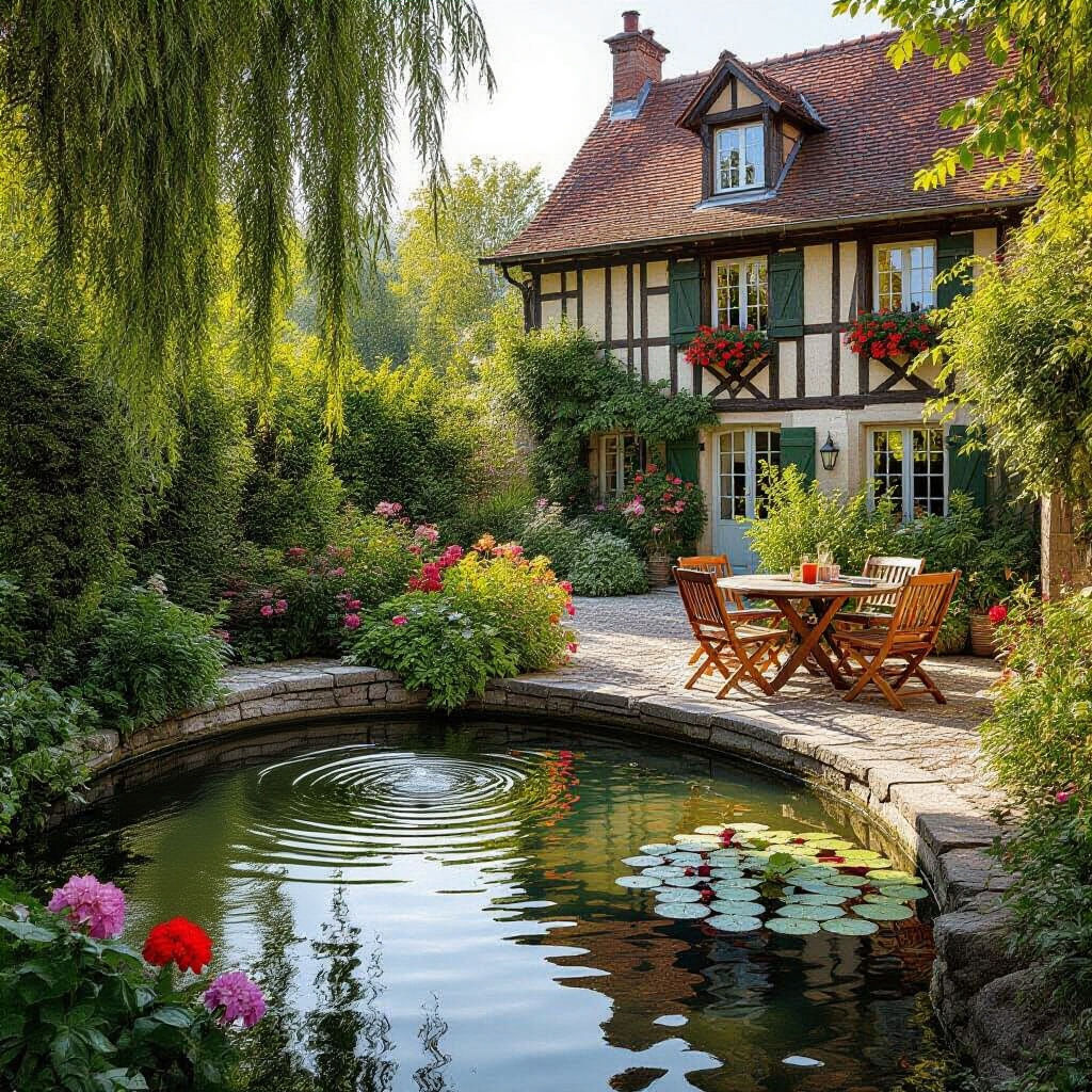 A serene medieval garden scene featuring a half-timbered manor house. The image depicts a couple of ducks swimming in a tranquil pond, surrounded by colorful flowers and lush vegetation. The scene is rendered with warm colors and soft brushstrokes, reminiscent of impressionist paintings.