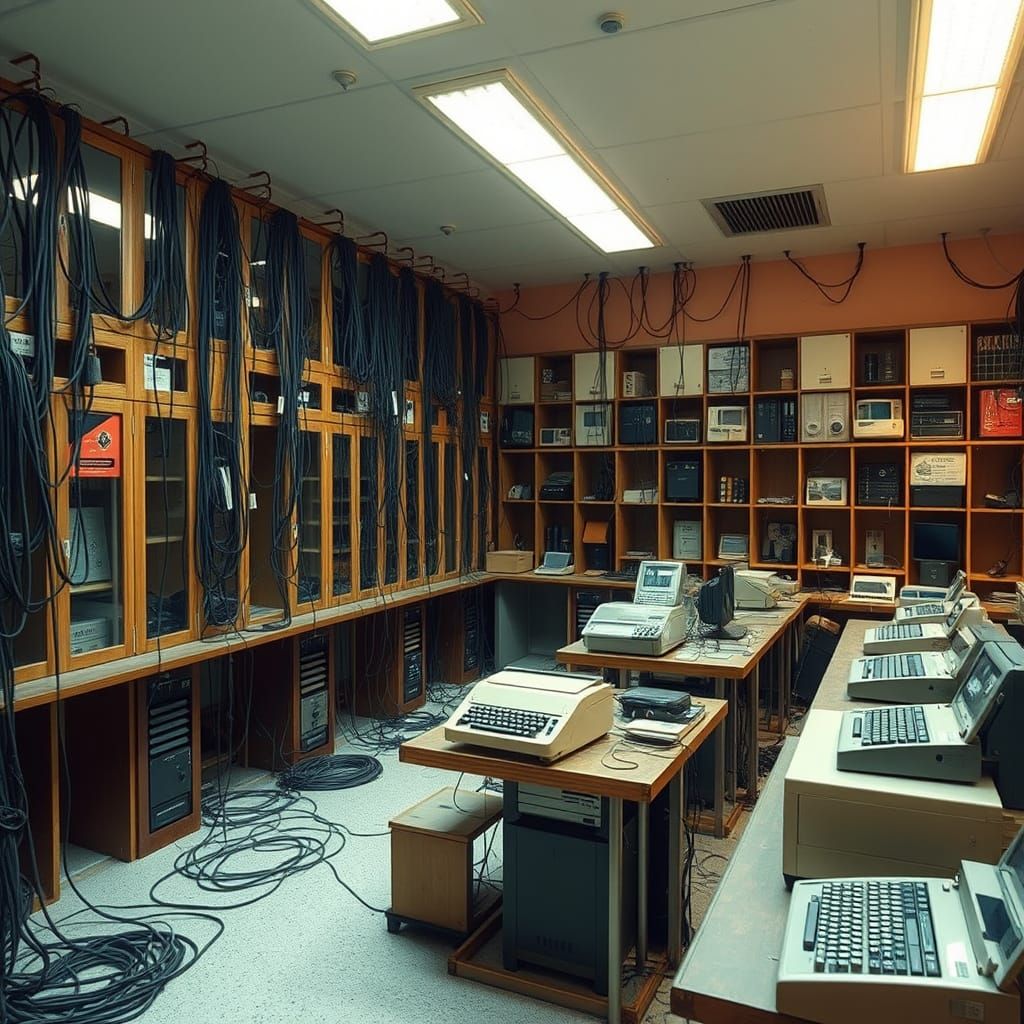 This image shows a dystopian, high-tech space filled with ancient machinery, including old teleprinters, typewriters, and telegraphs, amidst a catastrophic collapse.