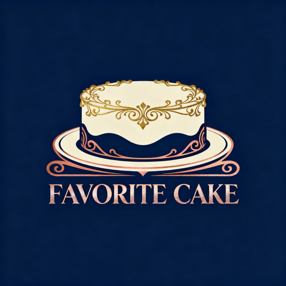 This image showcases a luxurious logo for 'FAVORITE CAKE', featuring an elegant cake silhouette with gold filigree. The brand name is in a sophisticated serif font, with a color palette of navy, rose gold, and cream, inspired by Art Nouveau.