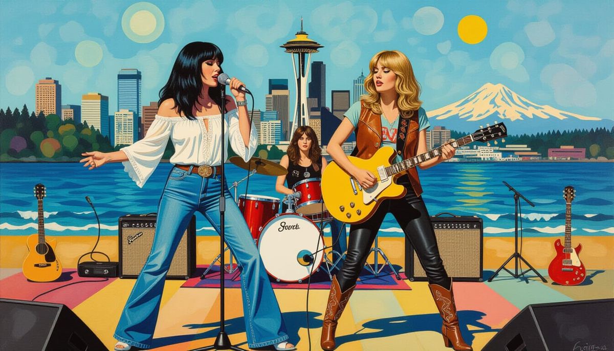 This detailed oil painting captures two female rock stars performing energetically on a sunlit beach stage. The Seattle skyline looms behind them in a 1977 surrealist style.