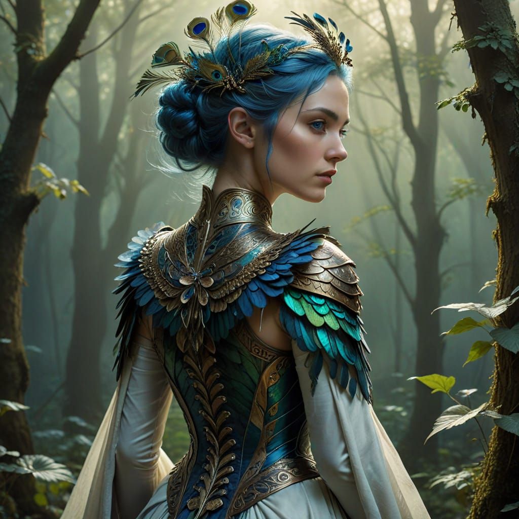 This image shows a stunning half-elf paladin posing in ornate, leaf-patterned armor adorned with intricate etchings and filigree. A luxurious white cloak with iridescent peacock feathers adds a touch of fantasy flair, set against a natural backdrop with soft, natural lighting.