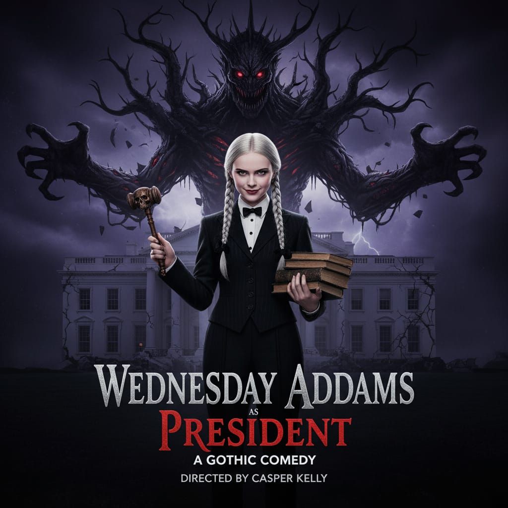 A movie poster featuring Wednesday Addams in the foreground, with a monstrous figure lurking in the background. This dark, gothic artwork is designed as a film poster.