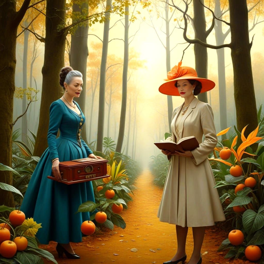 elegantly dressed charming lady in fantastic surrealistic scene with hyperrealistically depicted analog electronic parts, colorful fantastic fruit, colorful fantastic plants, ancient books, ancient manuscripts, sheet music, art supplies, vinyl records; intense vibrant colors, saturated luminous colors, ...